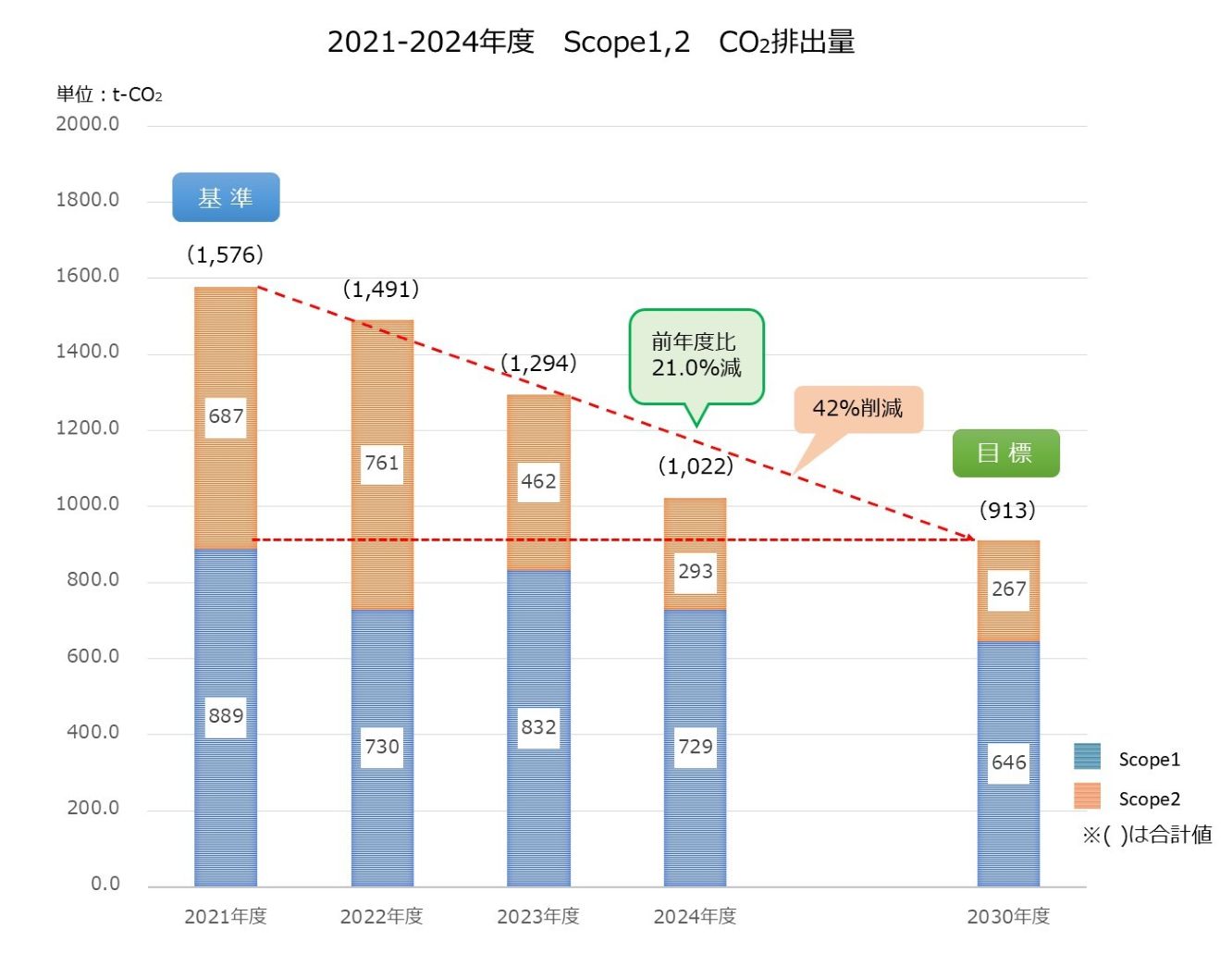 ・2030年までにScope1、2のCO₂排出量を42%(2021年度比)削減します。
