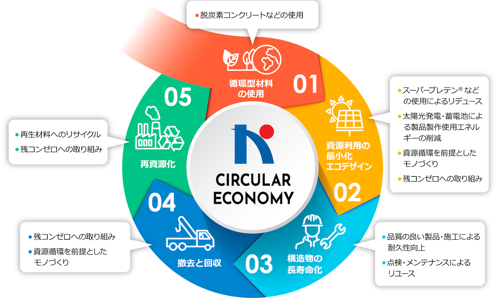 当社では、橋の建設から、維持管理、撤去に至るまでの過程を「日本ピーエス版サーキュラーエコノミー」として位置づけ、循環経済の推進に取り組んでいます。